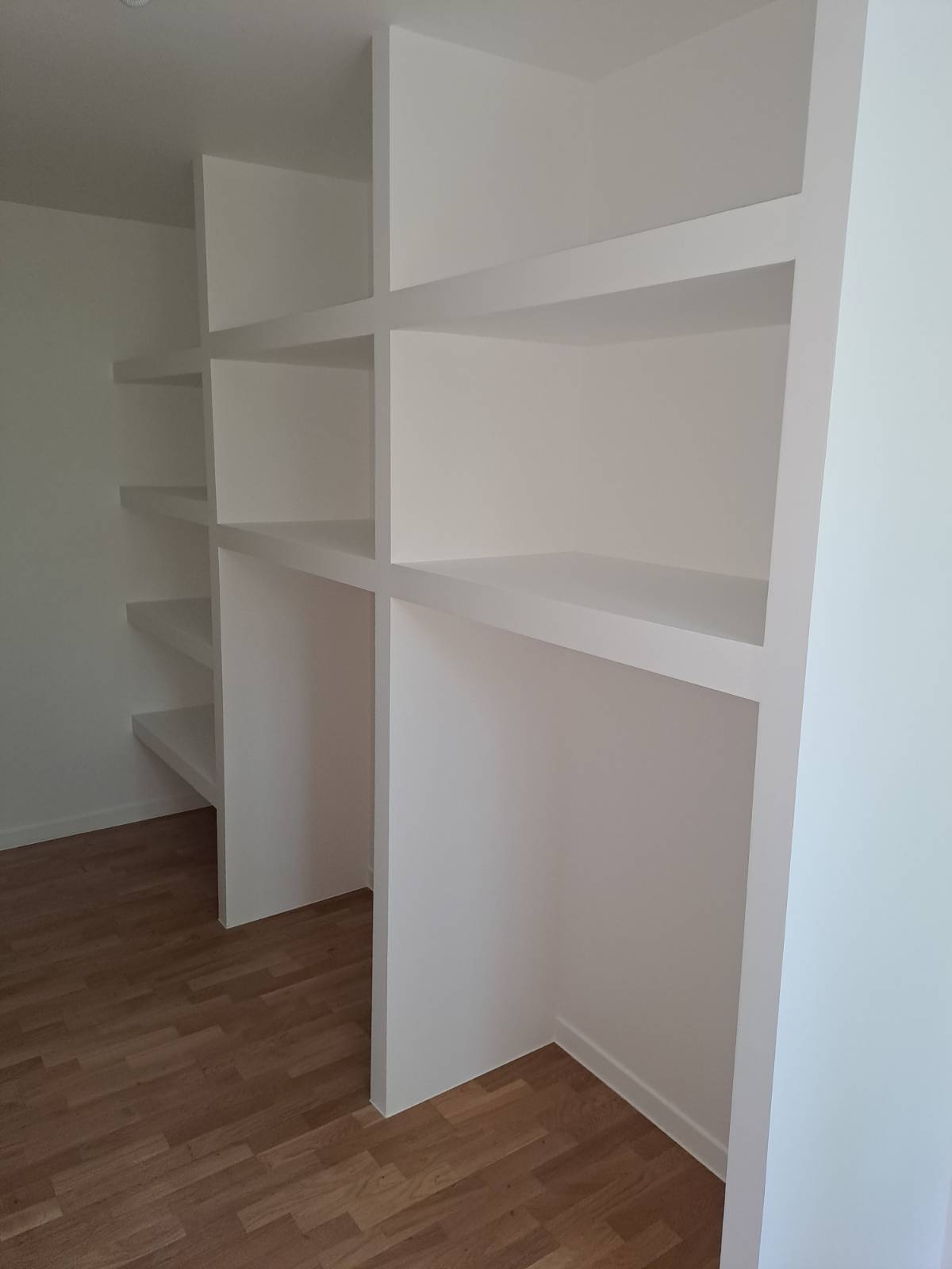Je me suis également spécialisé dans la création sur-mesure en placoplatre de vitrines, de dressings, de bibliothèques… pour optimiser votre espace.